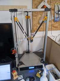 Der "MetalDelta" Drucker hat einen Bauraum von 200mm x 200mm mit 250mm Höhe. Als Materialien kommen PLA, PETG oder andere in Frage die bis ~270° verarbeitet werden können und auf dem max. 100° warmen Tisch haften.